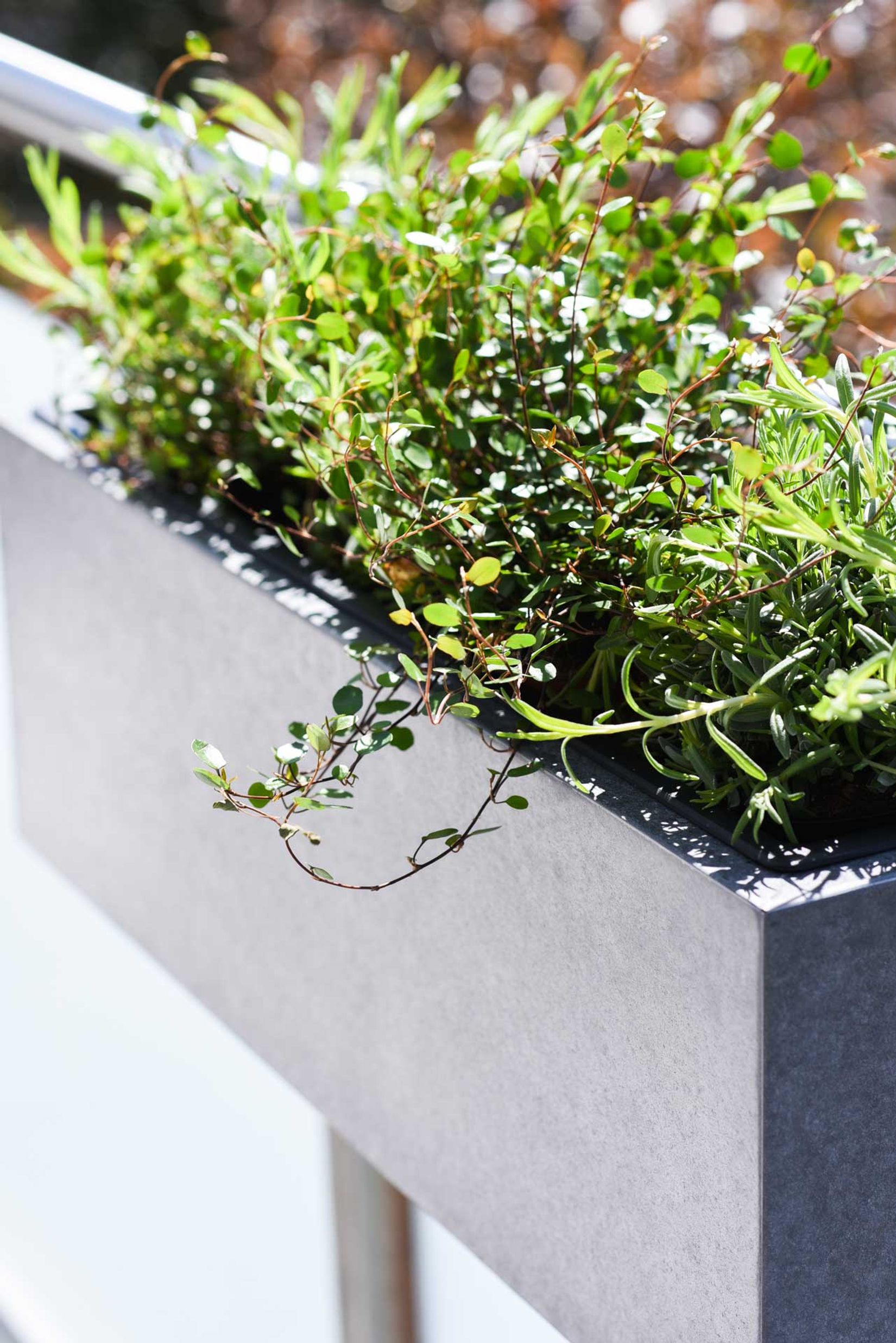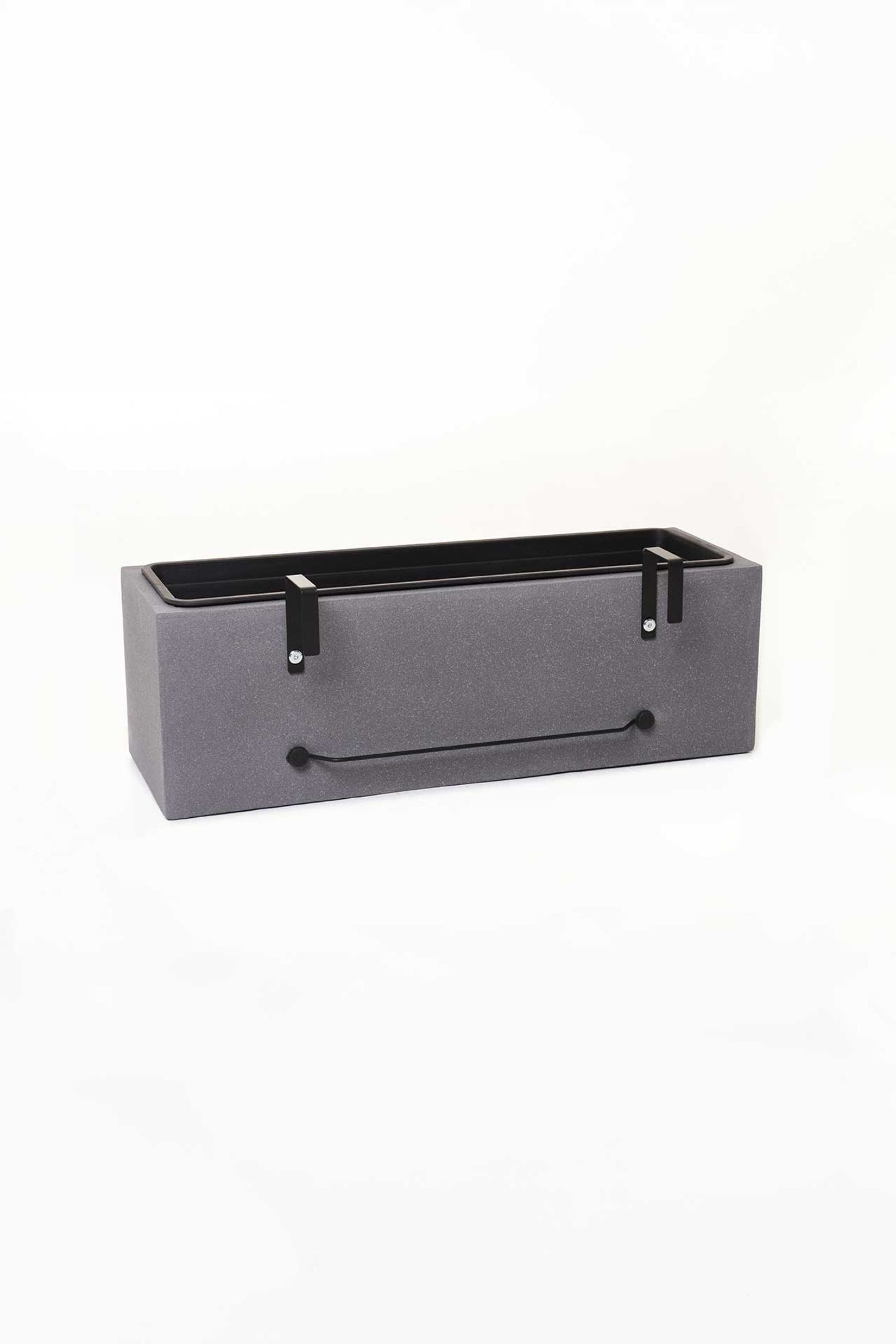 In modernem, schnörkellosen Design begeistert der Balkonkasten BENNO aus dem robustem Fiberzement aus der Serie Milano. Der rechteckige Blumenkübel für den Außen- oder Innenbereich kann spielend leicht an einem Geländer Ihrer Wahl aufgehängt werden. Dank einer Aufhängung aus pulverbeschichtetem, schwarzem Stahlblech gelingt die Montage des wetterfesten Kastens ohne Probleme. Auf diese Weise verschönern Sie Ihren Balkon, Ihre Terrasse oder ein Treppenhaus mit blühenden oder grünen Pflanzen. Hierbei wirkt der Blumenkasten BENNO in seiner grauen Farbigkeit wunderbar harmonisch zum frischen Blattwerk der Bepflanzung!