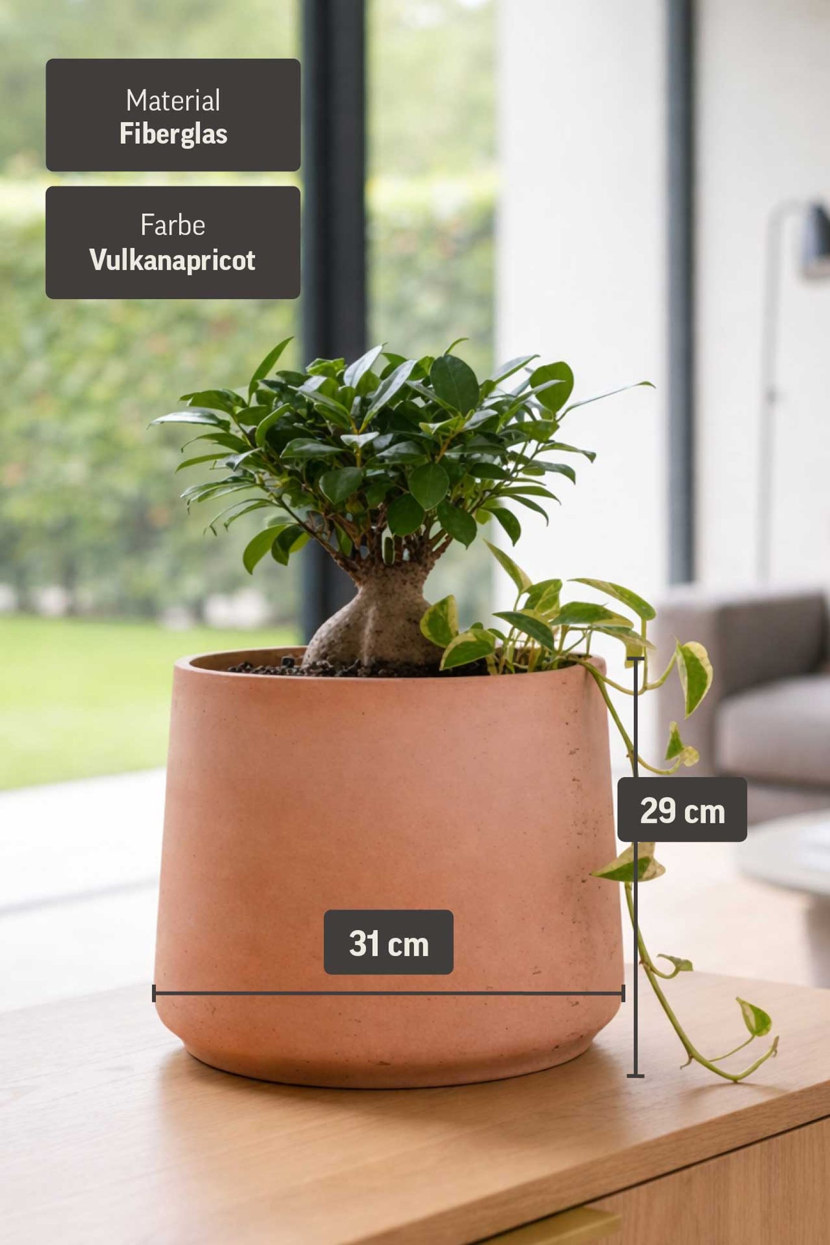Neben seinem ansprechenden Design punktet der TROPICO Blumenkübel mit durchdachter Funktionalität. Der Topfboden ist mit einem Ablaufloch ausgestattet, das mithilfe des mitgelieferten Stopfens flexibel genutzt werden kann. So eignet sich der Blumentopf gleichermaßen für den Innen- wie auch für den Außenbereich. Überschüssiges Gießwasser kann im Freien problemlos abfließen, während der Kübel im Wohnraum sicher und sauber eingesetzt wird. Das robuste Fiberglas sorgt dabei für ein angenehm geringes Eigengewicht bei gleichzeitig hoher Stabilität. Dadurch lässt sich der TROPICO Blumentopf mühelos umplatzieren und passt sich wechselnden Gestaltungsideen flexibel an. Auf der Terrasse, dem Balkon oder im Wintergarten wirkt er ebenso überzeugend wie im Eingangsbereich oder im Wohnraum. Seine Form deutet bereits an, was im Inneren zur Geltung kommen soll, und schafft so eine visuelle Verbindung zwischen Gefäß und Pflanze. Der TROPICO Blumenkübel ist damit nicht nur ein funktionales Pflanzgefäß, sondern ein bewusst eingesetztes Gestaltungselement, das Struktur, Ruhe und Natürlichkeit vermittelt. Entscheiden Sie sich für einen Blumentopf, der Ihre Pflanzen nicht nur beherbergt, sondern sie stilvoll inszeniert und mediterranes Lebensgefühl in jeden Bereich Ihres Zuhauses bringt.