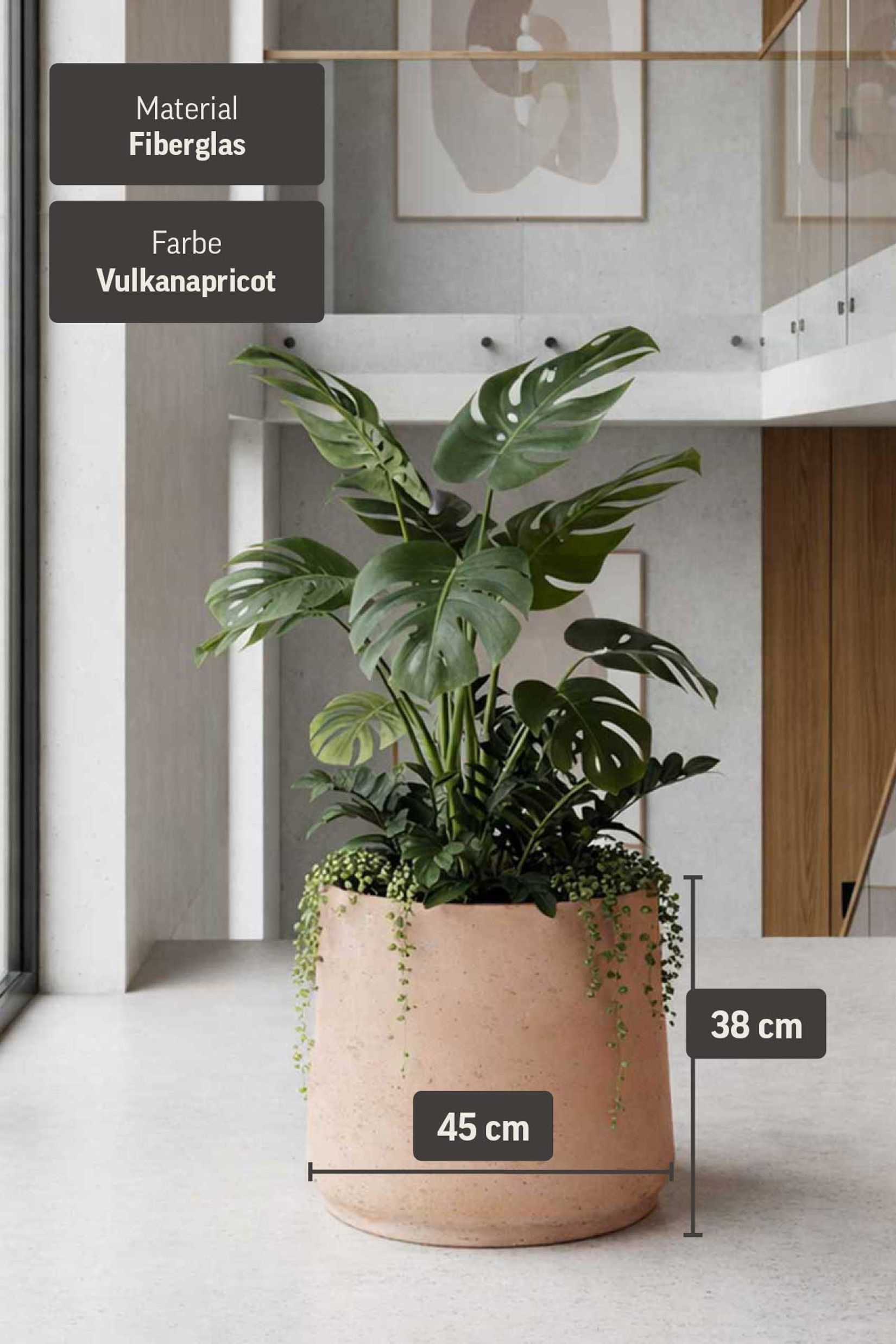 Neben seinem ansprechenden Design punktet der TROPICO Blumenkübel mit durchdachter Funktionalität. Der Topfboden ist mit einem Ablaufloch ausgestattet, das mithilfe des mitgelieferten Stopfens flexibel genutzt werden kann. So eignet sich der Blumentopf gleichermaßen für den Innen- wie auch für den Außenbereich. Überschüssiges Gießwasser kann im Freien problemlos abfließen, während der Kübel im Wohnraum sicher und sauber eingesetzt wird. Das robuste Fiberglas sorgt dabei für ein angenehm geringes Eigengewicht bei gleichzeitig hoher Stabilität. Dadurch lässt sich der TROPICO Blumentopf mühelos umplatzieren und passt sich wechselnden Gestaltungsideen flexibel an. Auf der Terrasse, dem Balkon oder im Wintergarten wirkt er ebenso überzeugend wie im Eingangsbereich oder im Wohnraum. Seine Form deutet bereits an, was im Inneren zur Geltung kommen soll, und schafft so eine visuelle Verbindung zwischen Gefäß und Pflanze. Der TROPICO Blumenkübel ist damit nicht nur ein funktionales Pflanzgefäß, sondern ein bewusst eingesetztes Gestaltungselement, das Struktur, Ruhe und Natürlichkeit vermittelt. Entscheiden Sie sich für einen Blumentopf, der Ihre Pflanzen nicht nur beherbergt, sondern sie stilvoll inszeniert und mediterranes Lebensgefühl in jeden Bereich Ihres Zuhauses bringt.