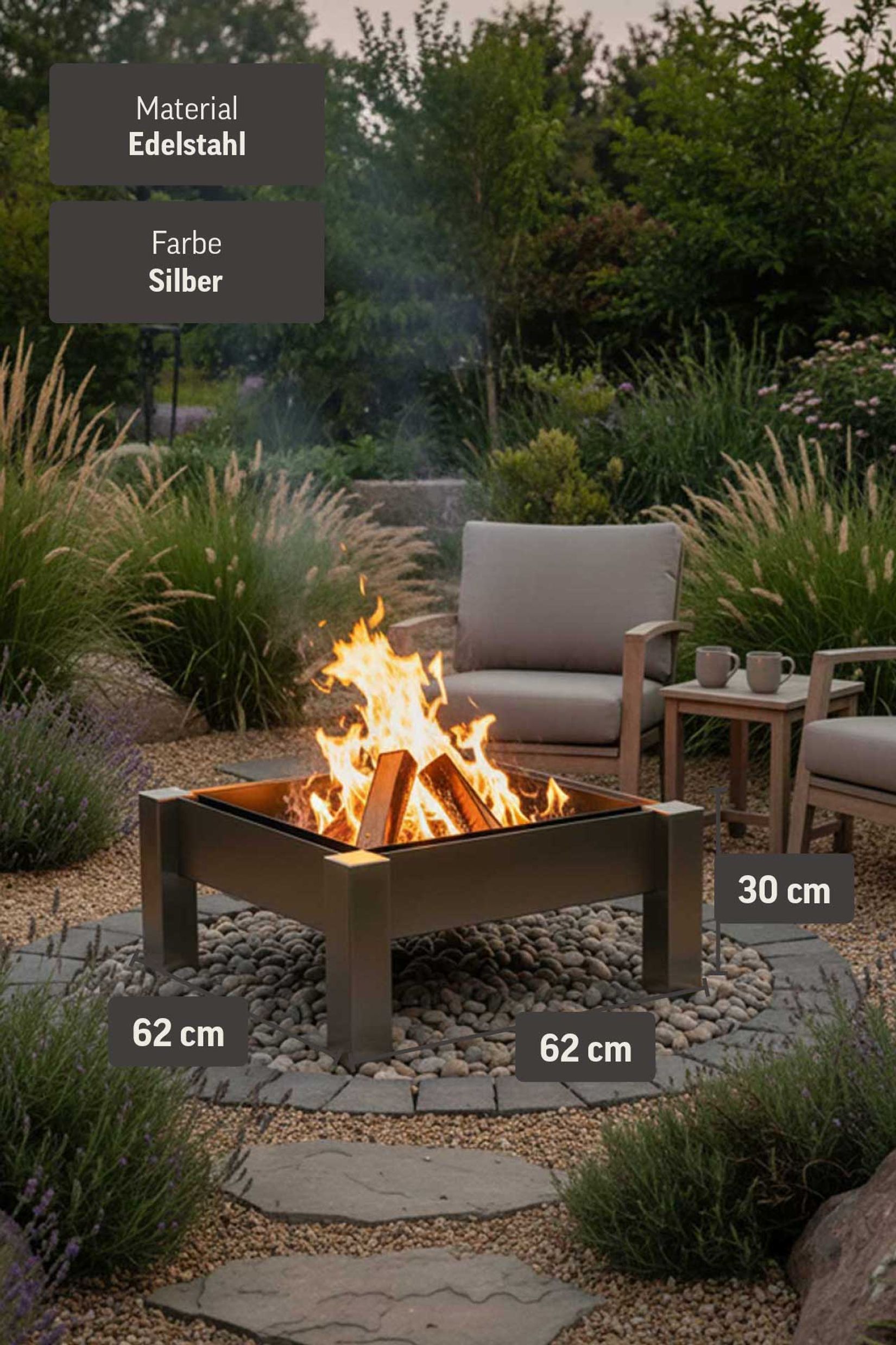 CUBICO ist eine Feuerschale aus Edelstahl, die durch das quadratische Design sehr elegant und schick wirkt. Sie steht sehr stabil auf vier Füßen und ist mit einer innen liegenden schwarzen Schale aus pulverbeschichtetem Stahlblech ausgestattet. Zur Säuberung und Entleerung der Asche kann diese einfach herausgenommen werden.