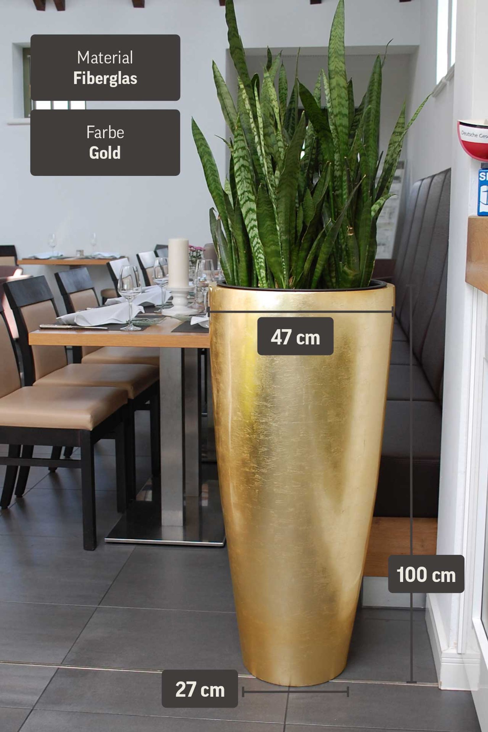 Dieses Pflanzgefäß lässt seine Umgebung in wunderschönem Glanz erstrahlen. Der exklusive Kübel besticht durch seine beeindruckende Optik und überzeugt mit seinem schimmernden Erscheinungsbild. Der Look in Gold verleiht Ihren Räumlichkeiten Eleganz. Gäste und Freunde werden vom Anblick dieses imposanten Pflanzkübels begeistert sein und Sie garantiert darauf ansprechen. Schmücken Sie Ihre Rezeption, den Eingangsbereich und die Empfangshallen mit diesem wunderschönen Blumenkübel.