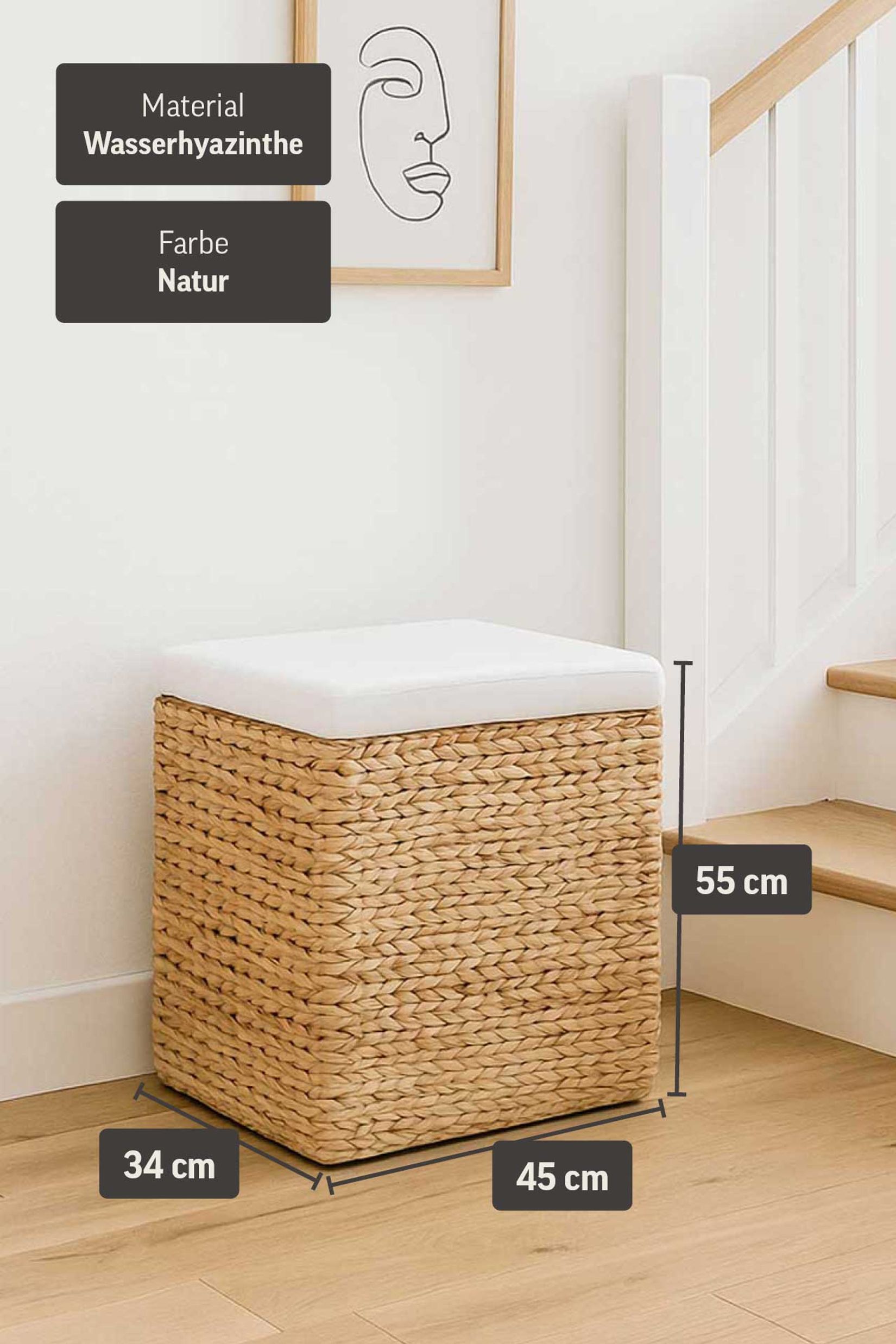 Ein gleichermaßen dekoratives wie praktisches Kleinmöbel ist der Sitzhocker PALU. Er begeistert mit einer stabilen Konstruktion aus Draht, wobei sein Unterbau mit einem Geflecht aus natürlicher Wasserhyazinthe versehen ist. Das horizontale Flechtwerk im Farbton Natur bringt ein wohnliches und gemütliches Flair in Ihr Zuhause oder in Ihre Geschäftsräume! Der abnehmbare Deckel des Hockers ist mit einem weichen Kissen ausgestattet, welches optimalen Komfort beim Sitzen oder Füße hochlegen gewährleistet. Im Innenbereich der kleinen Truhe ist ein herausnehmbares und waschbares Inlett aus Baumwolle mit einem praktischen Klettverschluß angebracht.
