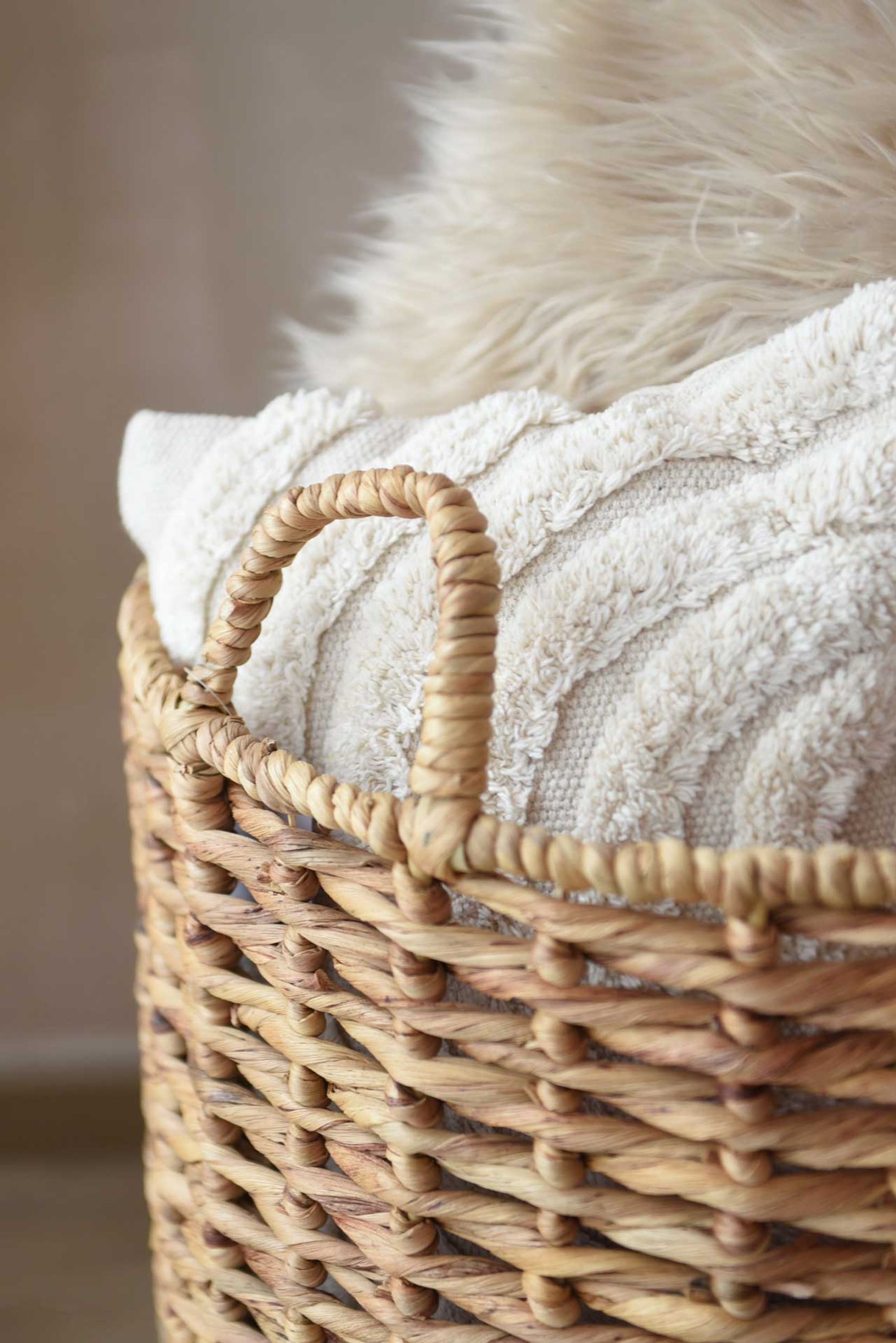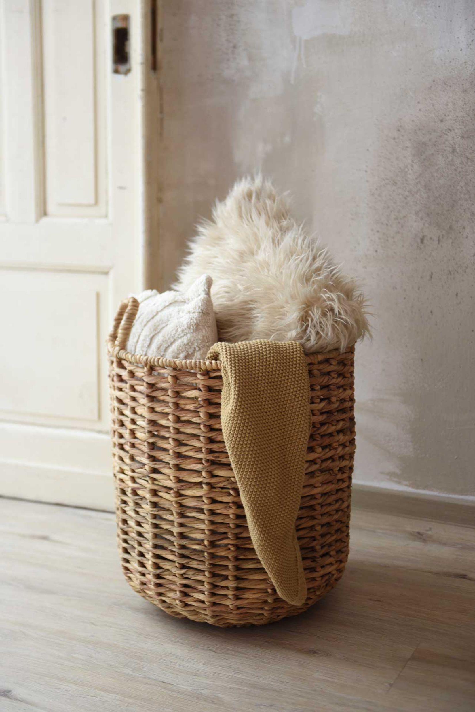Praktisch durchdacht ist der Dekokorb BACINO mit zwei stabilen Griffen ausgestattet, die dezent in das Flechtmuster integriert sind. So lässt er sich leicht umstellen und flexibel nutzen – ob im Wohnzimmer für Decken, im Schlafzimmer für Kissen oder im Kinderzimmer für Spielzeug. Auch als dekoratives Element im Eingangsbereich macht er eine ausgezeichnete Figur und sorgt dafür, dass Kleinigkeiten stilvoll verstaut sind. Das robuste Material Wasserhyazinthe überzeugt nicht nur durch seine natürliche Ausstrahlung, sondern auch durch Langlebigkeit. Jeder Korb ist von Hand gefertigt und dadurch besonders stabil – eine nachhaltige Lösung, die über viele Jahre Freude bereitet. So wird der Korb BACINO schnell zu einem unverzichtbaren Ordnungshelfer, der Funktionalität und Ästhetik vereint. Er räumt auf und wirkt dabei wie ein natürliches Design-Highlight. Ob als praktische Aufbewahrungslösung oder als dekoratives Accessoire – dieser runde Dekokorb aus Wasserhyazinthe ist eine stilvolle Ergänzung für jedes Zuhause.