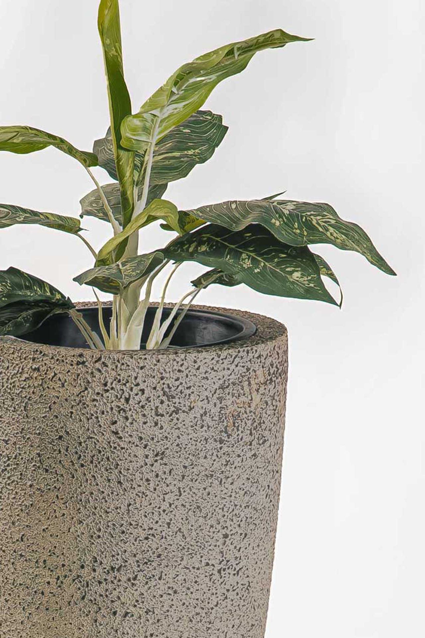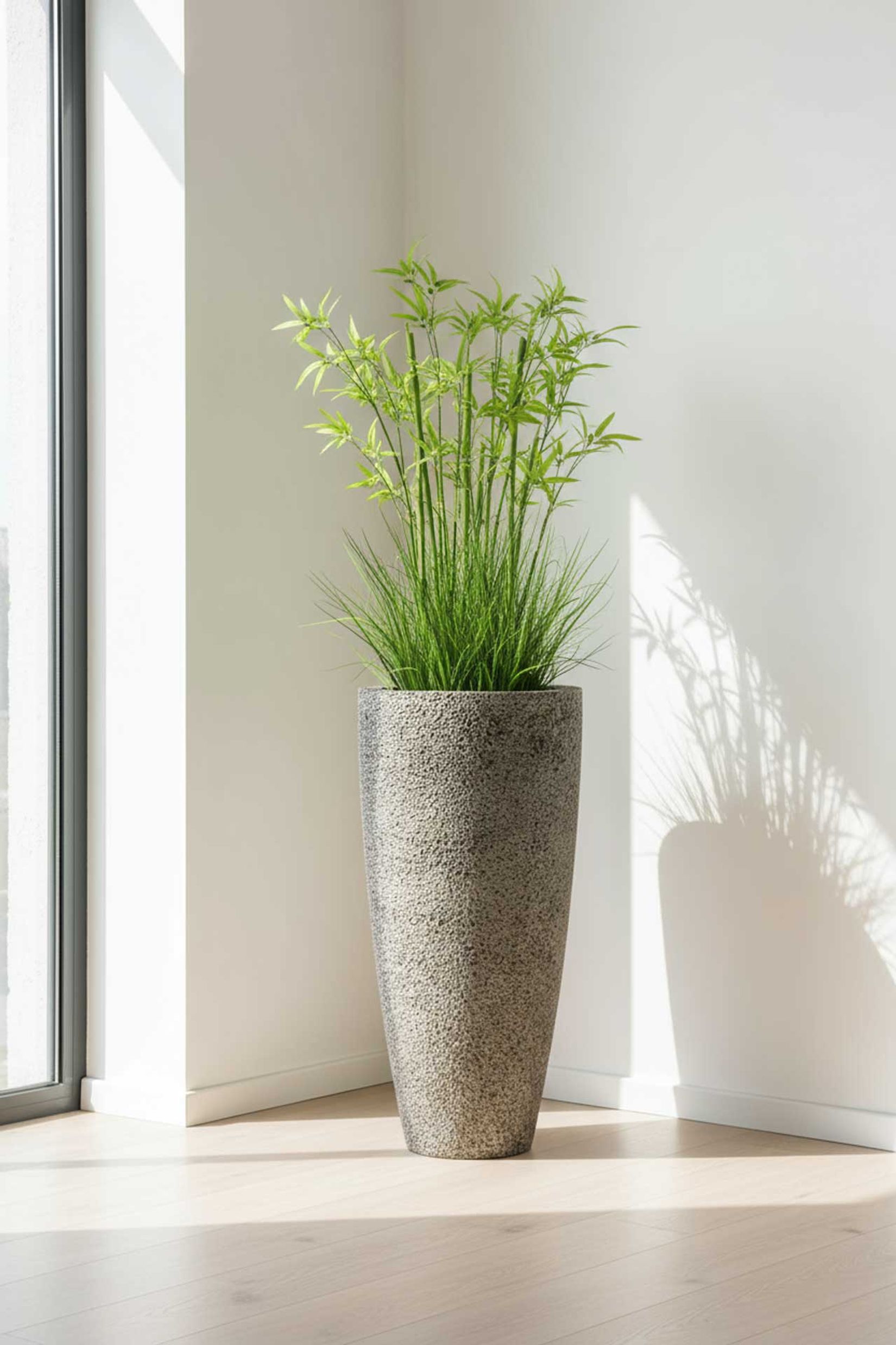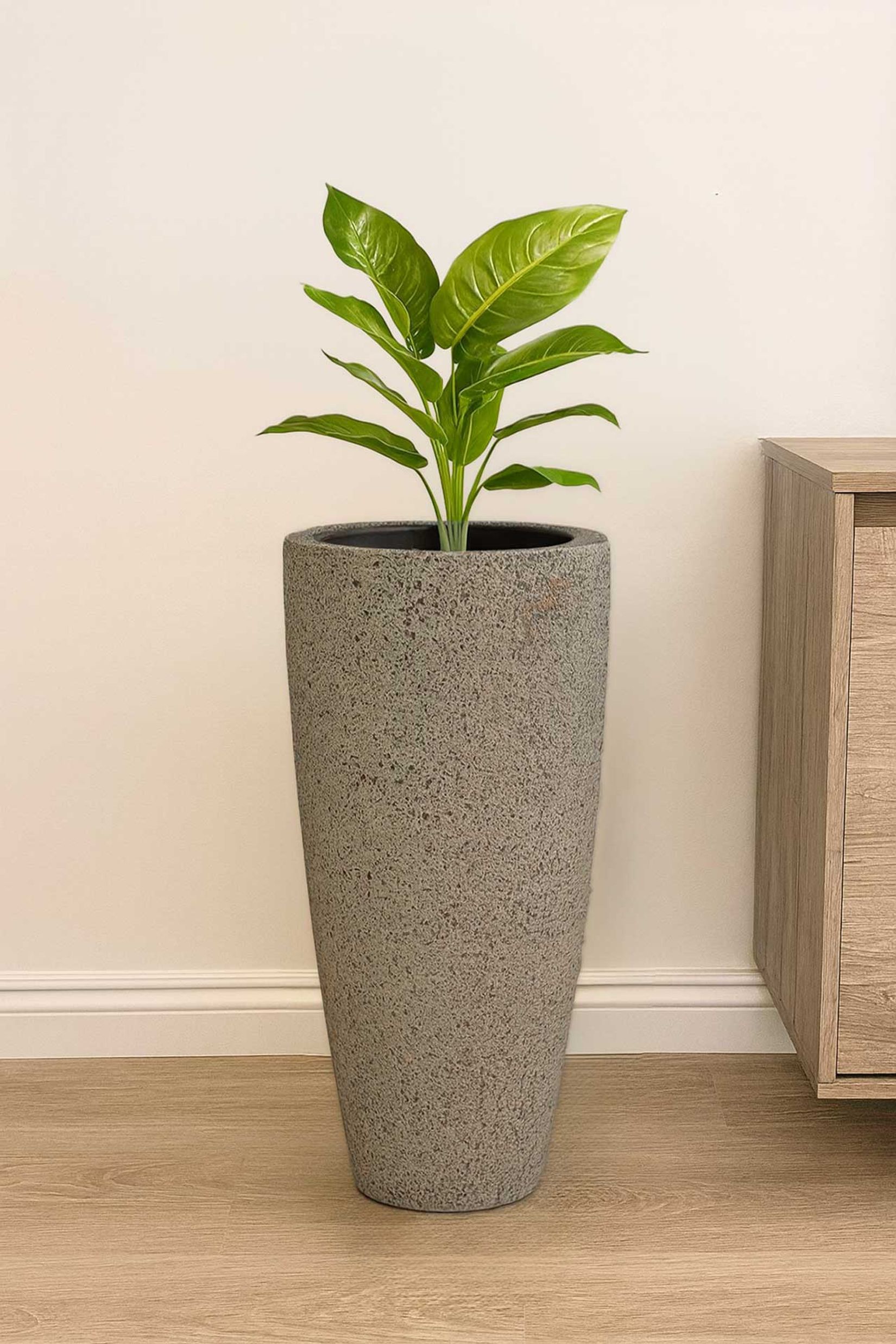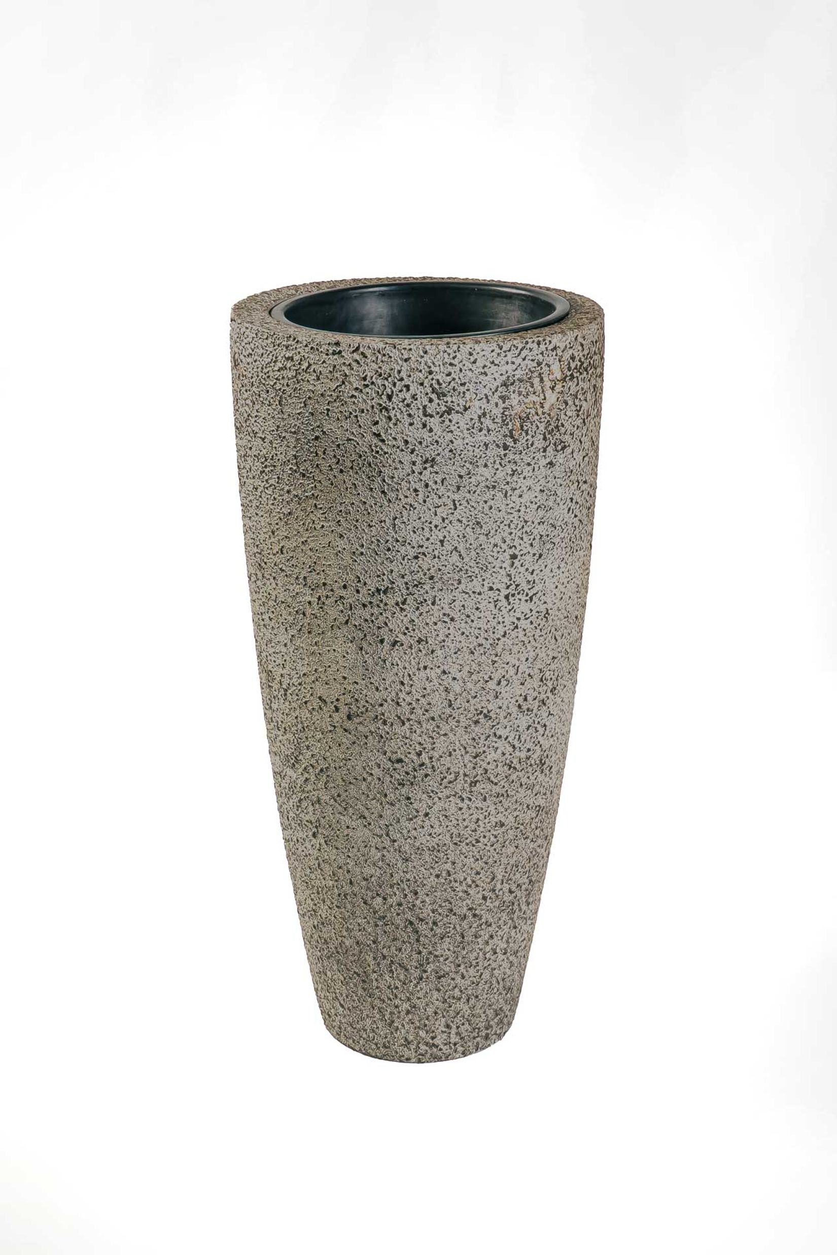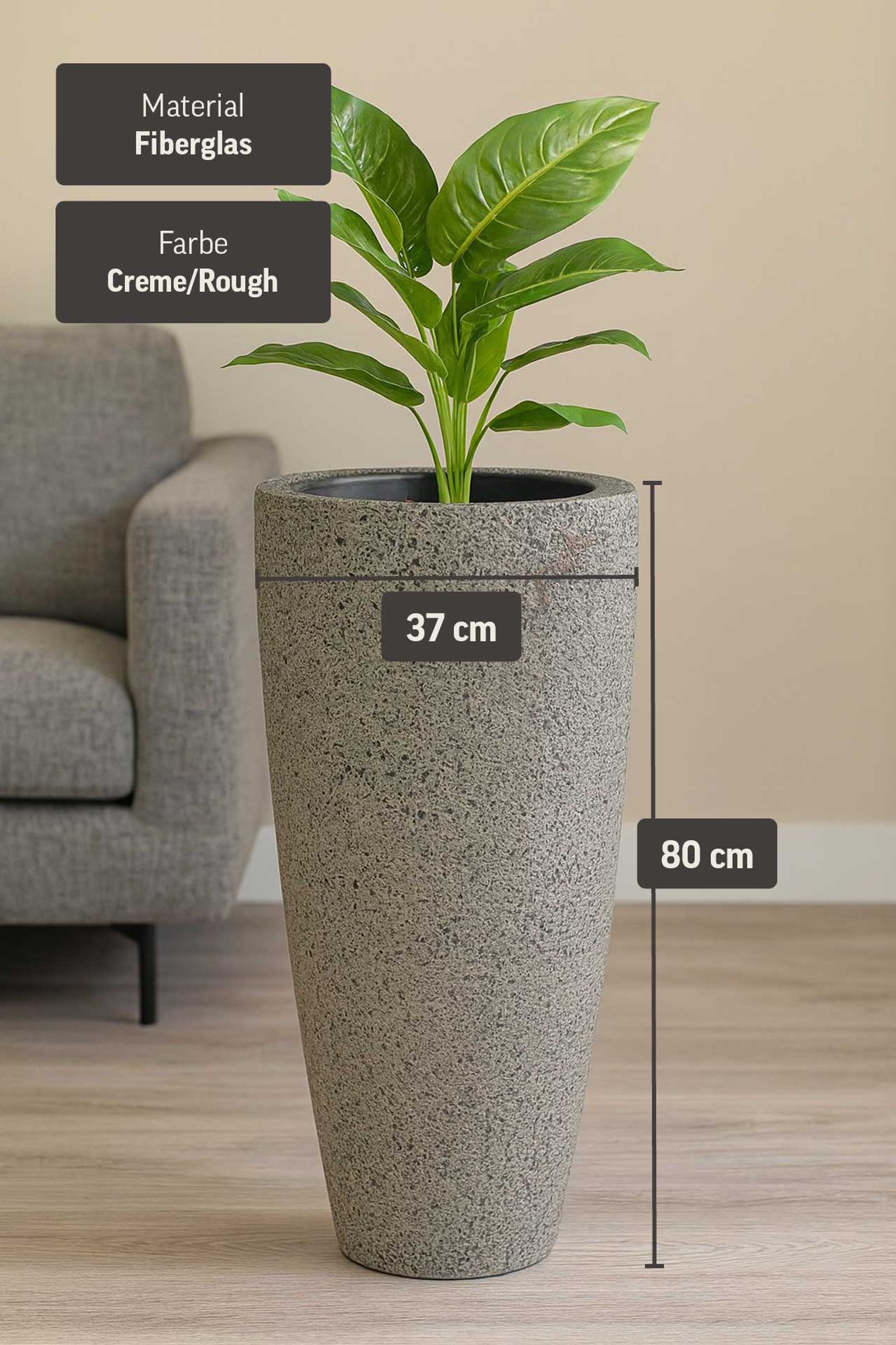 Interessanter Pflanzkübel? Absolut. Der CITY in der Farbgebung Creme Rough ist ein sehr außergewöhnliches Schmuckstück in bestechender Optik. Die Hell-Dunkel-Sprenkelung auf der Oberfläche betont die anmutige, konische Form sehr schön und ist zudem ein wundervoller Kontrast zur Pflanze. Farbe wie Form lassen den CITY extrem massiv aussehen, beinahe als wäre er aus einem großen Stück Stein gehauen. Wenn Sie sich also eine besonders natürliche Deko für Ihre Gewächse und für Ihr Zuhause suchen, sind Sie mit dem CITY Blumenkübel sicherlich gut beraten. Tatsächlich ist die Bodenvase aus einem leichten, aber robustem Fiberglas gearbeitet worden. Ein sehr solider Werkstoff, der Ihnen beim Tragen jedoch wenig Mühe bereiten wird. Somit bekommt das Handling des CITY sofort einen positiven Check.