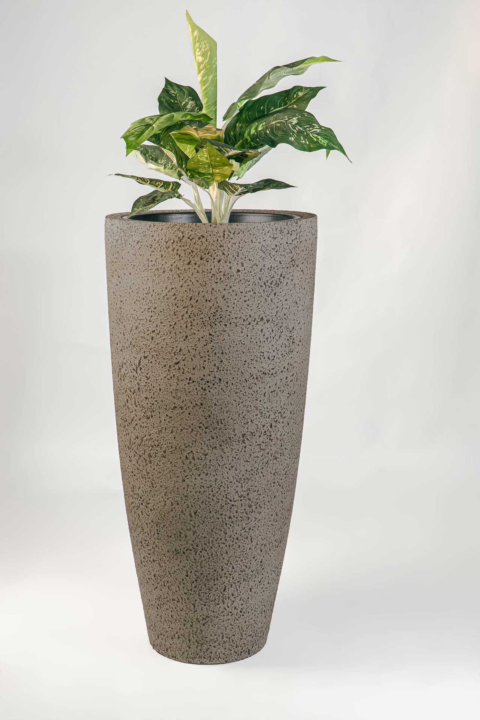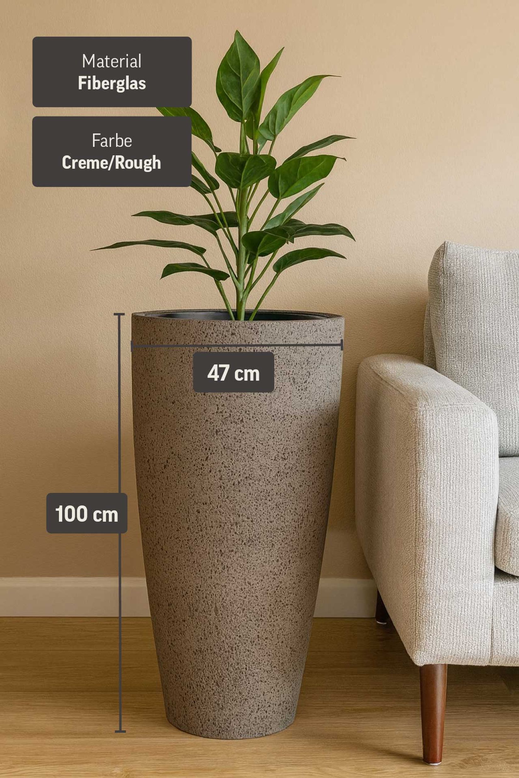Interessanter Pflanzkübel? Absolut. Der CITY in der Farbgebung Creme Rough ist ein sehr außergewöhnliches Schmuckstück in bestechender Optik. Die Hell-Dunkel-Sprenkelung auf der Oberfläche betont die anmutige, konische Form sehr schön und ist zudem ein wundervoller Kontrast zur Pflanze. Farbe wie Form lassen den CITY extrem massiv aussehen, beinahe als wäre er aus einem großen Stück Stein gehauen. Wenn Sie sich also eine besonders natürliche Deko für Ihre Gewächse und für Ihr Zuhause suchen, sind Sie mit dem CITY Blumenkübel sicherlich gut beraten. Tatsächlich ist die Bodenvase aus einem leichten, aber robustem Fiberglas gearbeitet worden. Ein sehr solider Werkstoff, der Ihnen beim Tragen jedoch wenig Mühe bereiten wird. Somit bekommt das Handling des CITY sofort einen positiven Check.