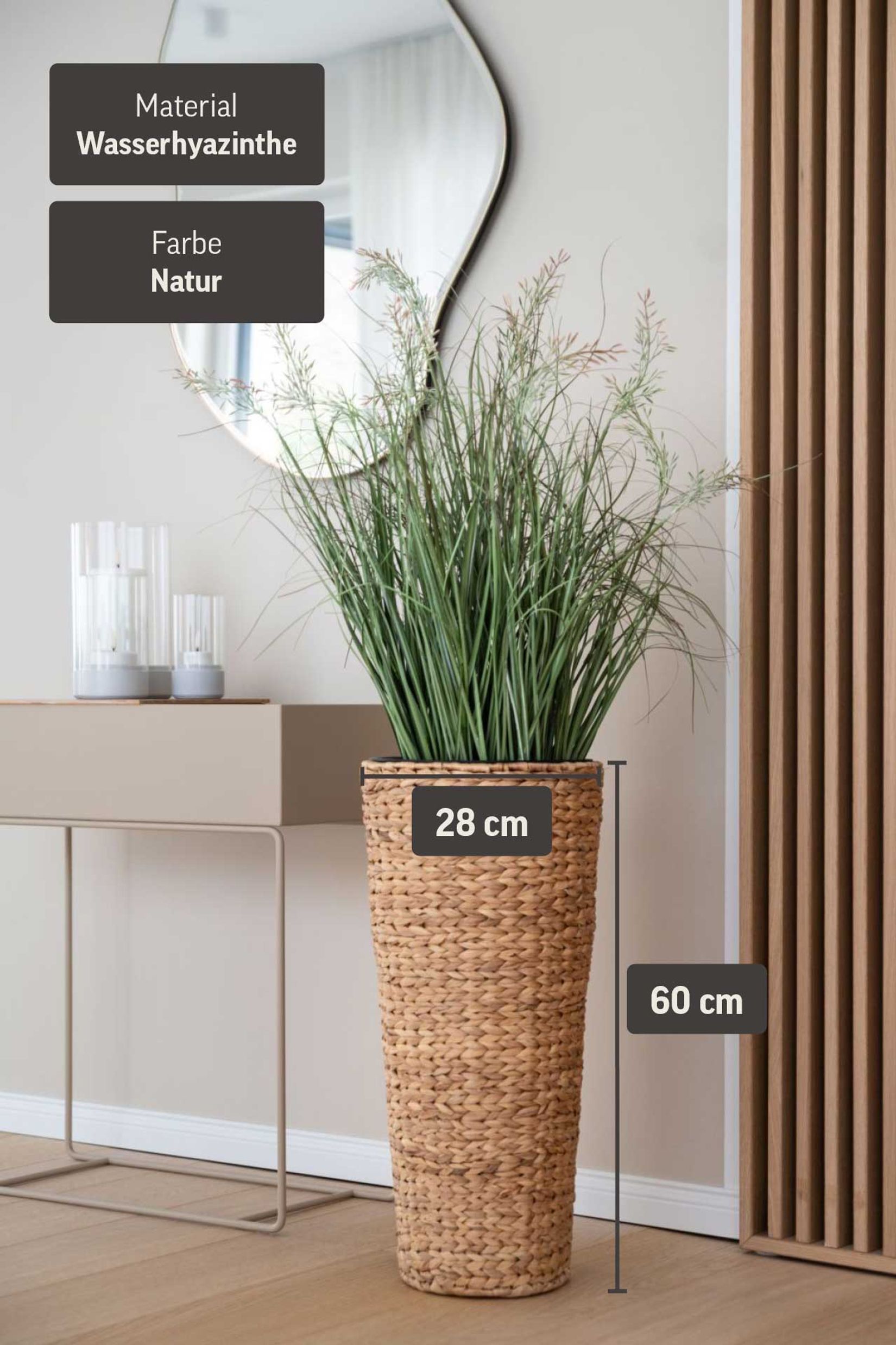Die Wasserhyazinthe hat sich, aus einer einst einfachen Sumpfpflanze, zu einem gefragten Material entwickelt. Mittlerweile werden nicht nur Blumenkübel und schöne Wohnaccessoires sondern auch Möbel oder andere Dekoartikel aus ihr gefertigt. Dieses Material ist sehr robust und widerstandsfähig. Die spezielle Art der Trocknung sorgt für Keimfreiheit und verhindert Pilzbildung. Das eingearbeitete Drahtgeflecht sorgt für zusätzliche Stabilität. Zusammengefasst ist dieser Kübel eine optische Bereicherung mit natürlichem Charme für Ihre Wohnräume. Selbstverständlich erhalten Sie bei uns diese Basics auch in vielen anderen Größen und Designs. Stöbern Sie gern durch unser Sortiment, es lohnt sich.