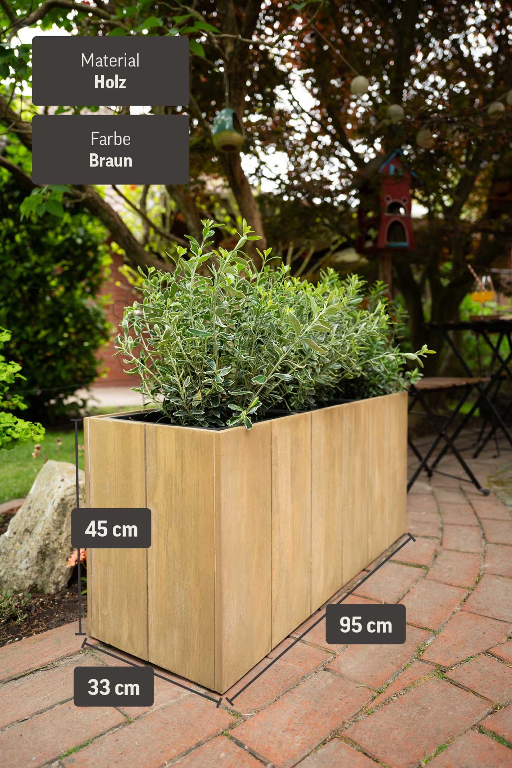 - Pflanztrog besteht aus Akazienholz, mit attraktiver Holzstruktur in Hellbraun