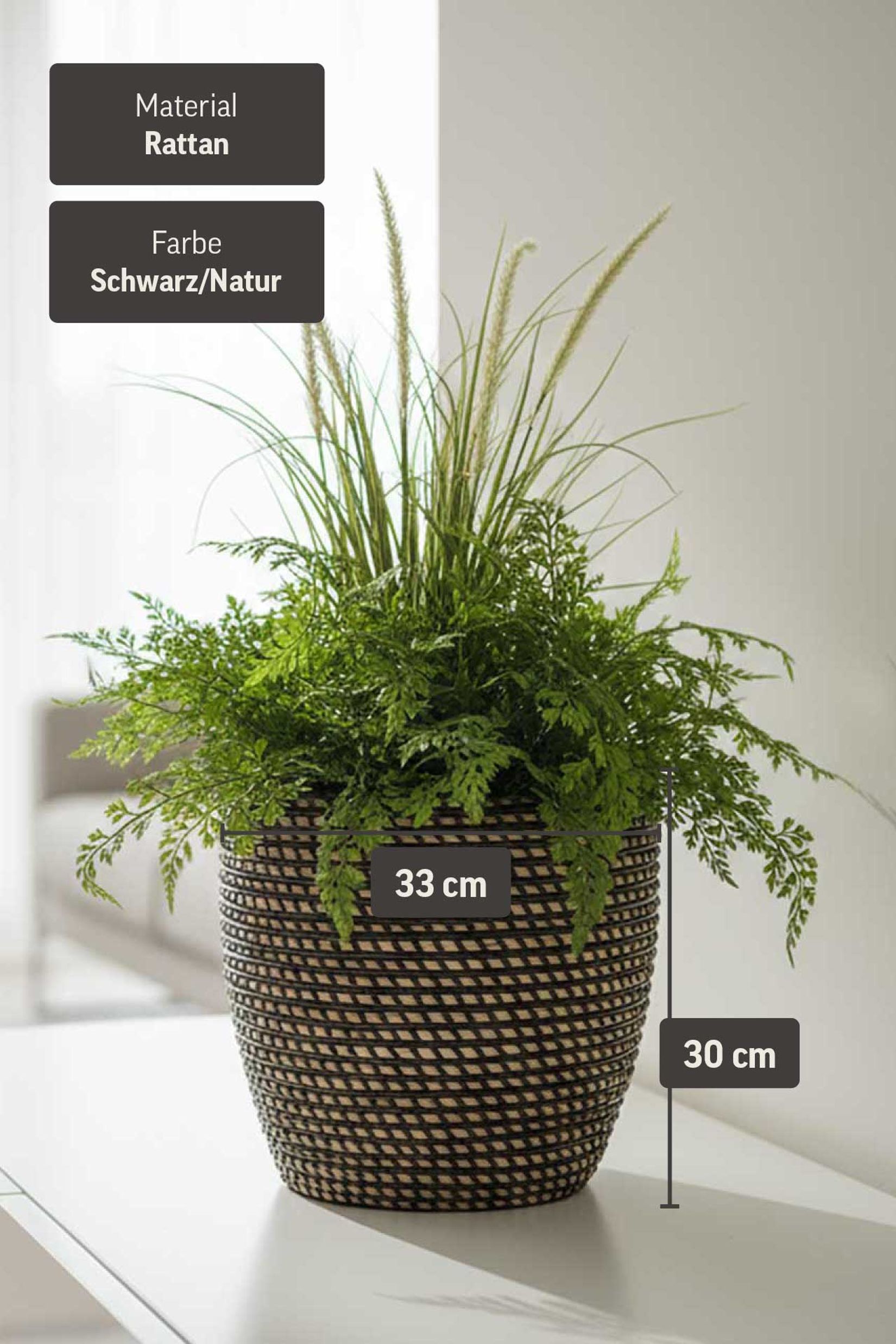 Ob große Zimmerpflanze, üppiger Farn oder dezente Blütenarrangements – der MASTELLO Pflanzkübel setzt jede Pflanze perfekt in Szene. Seine Mischung aus heller Rattanstruktur und schwarzen Details verleiht dem Raum Tiefe und Natürlichkeit, ohne sich aufzudrängen. Im Wohnzimmer, Schlafzimmer, Essbereich oder Homeoffice: Dieser Blumentopf schafft überall ein stilvolles Ambiente und bringt die beruhigende Wirkung von Naturmaterialien in Ihr Zuhause. Entscheiden Sie sich mit MASTELLO für ein Wohnaccessoire, das Funktionalität, Handwerkskunst und zeitgemäßes Design in einem Produkt zusammenführt.