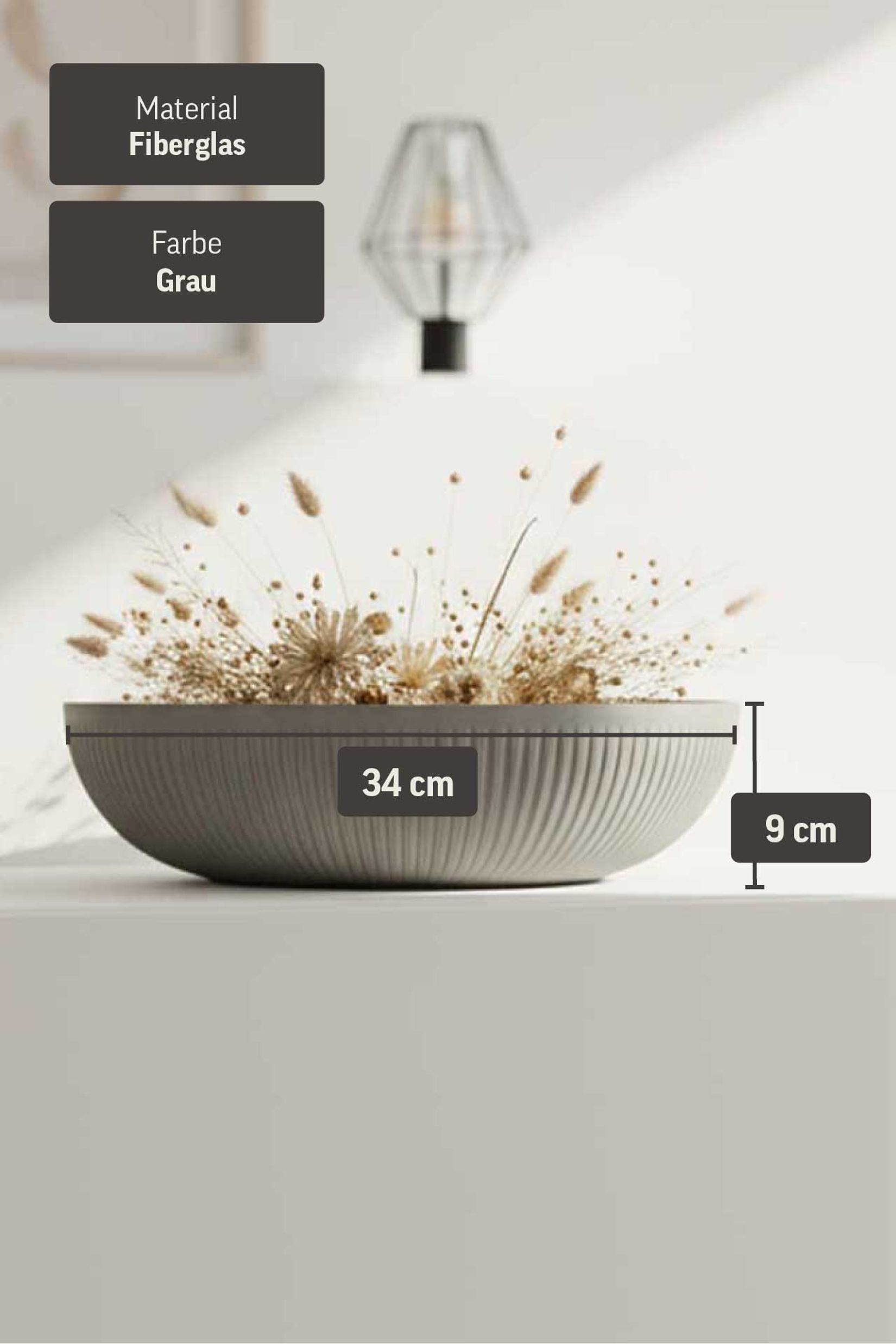 Gefertigt aus robustem Fiberglas punktet die PLANA Pflanzschale mit hoher Widerstandsfähigkeit und einer langlebigen Qualität. Das Material ist witterungsbeständig und formstabil, sodass die Schale auch im Winter problemlos im Außenbereich eingesetzt werden kann. Auf der Terrasse, dem Balkon oder im Garten behält sie ihre ansprechende Optik und bleibt dabei funktional und pflegeleicht. Gleichzeitig ist Fiberglas angenehm leicht, was ein flexibles Umstellen ermöglicht – ideal für alle, die ihre Dekoration gerne anpassen. Auch im Innenbereich entfaltet PLANA ihre Wirkung, etwa als stilvolle Dekoschale auf einem Tisch, einem Highboard oder im Eingangsbereich. Die neutrale graue Farbgebung lässt sich hervorragend mit Naturmaterialien, Holz, Metall oder Stein kombinieren und unterstreicht verschiedenste Einrichtungsstile.