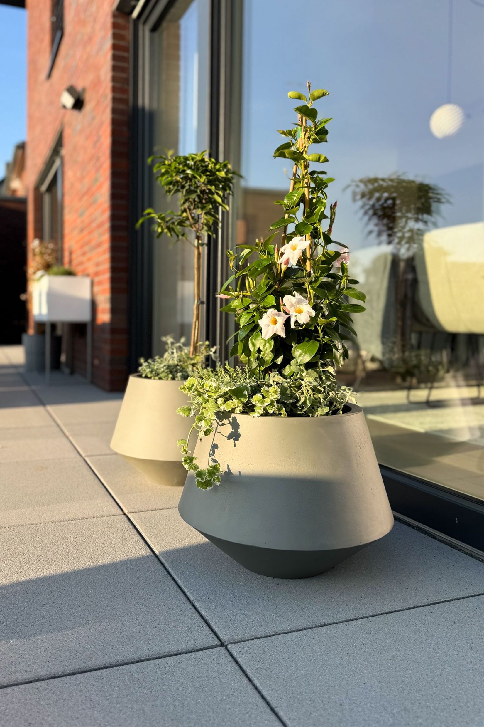 Nach draußen darf der BERBELIT Pflanzkübel deshalb, weil er aus qualitativem Fiberglas verarbeitet wurde. Ein sehr robustes Material, das selbst frostige Temperaturen während der Winterzeit spielend ab kann. Somit hält er viele Verwendungsmöglichkeiten für Sie bereit. Wie oben erwähnt mit jeder Art Pflanze für Ihre Räumlichkeiten, für einen Wintergarten, für die Terrasse und den Garten. Im Außenbereich können sowohl saisonale wie dauerhaft haltbare Gewächse zum Einsatz kommen. Je nach persönlichen Geschmack lassen sich so tolle Arrangements erstellen, die in diesem Wohlfühlbereich für eine entspannte, natürliche Atmosphäre sorgen. Auch ein Eingangsbereich bekommt mit einem BERBELIT Pflanzkübel eine ganz besonders moderne Note. Das graue Beton-Design unterstreicht die Natürlichkeit der Pflanzen und passt sich sehr schön an die Umgebung an.