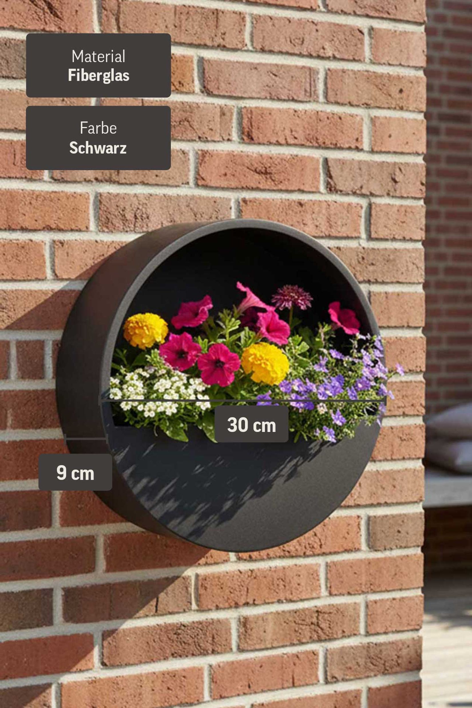 Voll im zeitlichen Trend sind Sie mit dem schwarzen MURA Wandtopf von VIVANNO. Das wirklich stattlich große, runde Behältnis fällt sofort ins Auge. Es definiert Deko einfach auf eine ganz neue Art. Mit ihm haben Sie die Möglichkeit Blumenschmuck vertikal an einer Wand oder Mauer zu präsentieren. Auf knapp halber Höhe wurde der MURA dafür mit einer Verblendung versehen, die problemlos mit Erde gefüllt werden kann. Darin haben Ihre Gewächse in jedem Fall ausreichend Platz und sind durch die umlaufende, äußere Kante auch noch bestens geschützt. Der Wandblumentopf hält sich in Form und Farbe zwar eigentlich schlicht, lässt dabei aber umso mehr Spielraum, wenn es um Bepflanzung und Kompatibilität zu den unterschiedlichen Einrichtungsstilen geht. Schwarze Optik und runde Flächen gehen schließlich immer.